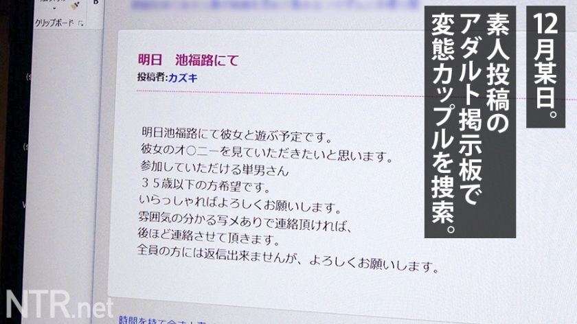 【掲示板から始まった背徳の記録】某有名掲示板で出会ったのは、婚約中という一組のカップル。彼らには「寝取られ」という他人には言えない歪んだ願望があった。池袋で合流した二人は、秘密を厳守することを条件にカメラの前でその本性を現す。白く艶やかな肌を持つスレンダー美人の菜々さんが、婚約者の目の前でピンクの電マに身を任せると、彼氏はその光景に興奮し自慰を始める。二人の男に見つめられる快感に、菜々さんの身体は妖艶に跳ね、エビ反りになって絶頂を迎えた。この背徳感に完全に魅了された二人は、さらなる快楽を求めプロ男優との本番撮影を承諾。素人カップルが深淵へと足を踏み入れる、リアルな寝取られドキュメントが幕を開ける。